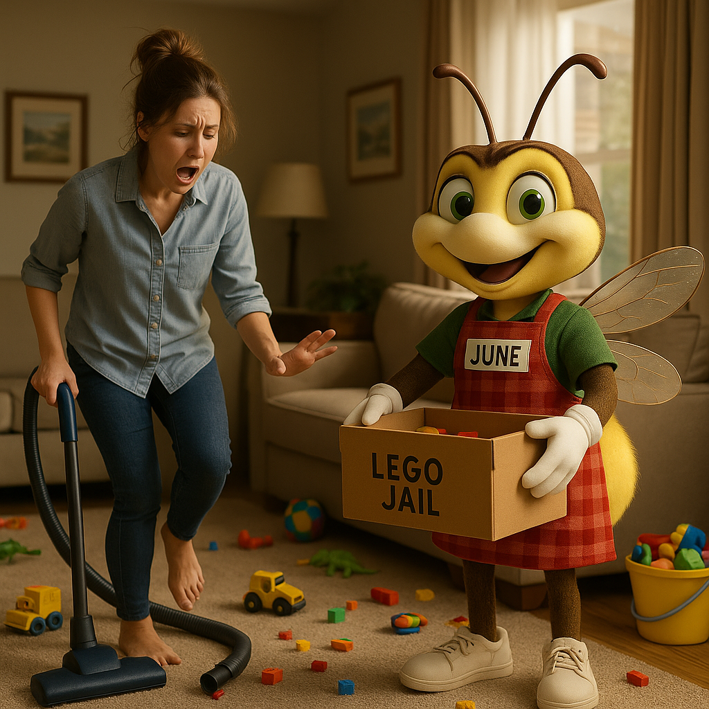 You’d think after three kids, one dog, and a husband who still hasn’t figured out how to hang up a bath towel, I’d have learned a thing or two about landmines in my own home. But nothing — and I mean nothing — prepares you for stepping barefoot on a Lego. There I was, vacuum in hand, feeling like a domestic goddess in my red rubber gloves, ready to conquer the living room. The kids had finally gone outside, the dog was asleep, and I had ten whole minutes of uninterrupted cleaning time. (Cue angel choir.) I started pushing the vacuum across the carpet with all the confidence of a woman in a Swiffer commercial. And then I heard it — that unmistakable clinkety-clunk-crunch sound. My vacuum had swallowed something that wasn’t dust. A mother knows that sound. My heart dropped into my socks: the vacuum had eaten a Lego. Now, if you’ve ever vacuumed up a Lego, you know there are only two outcomes: either it rattles around in the hose like a penny in a piggy bank, or it explodes into the dust bag, where it will live forever as a $3 piece of plastic entombed in lint. Either way, there will be tears. (Yours or the child’s. Probably both.) I froze, mid-vacuum. I knew if the kids found out, they’d form a rescue mission and dismantle the Hoover like a team of tiny, very angry engineers. My youngest once cried harder over a missing Lego minifigure head than when he broke his arm. True story. So I did what any rational parent would do: I pulled the plug, shook the vacuum like a maraca, and prayed to the household gods. No luck. The Lego was gone, sacrificed to the dust bunny kingdom. By the time the kids came back in, I had my story straight. “What Lego? No, I didn’t see one.” But of course, my daughter spotted the missing wing of her spaceship faster than the FBI can track a cell phone ping. Cue the drama. The wailing. The accusations. You’d think I had personally set fire to the entire Lego catalog. That night, as I nursed my Lego-injured foot with a bag of frozen peas, I had an epiphany: Legos are not toys. They’re booby traps, designed to keep parents humble. And maybe… just maybe… my living room doesn’t need to be vacuum-perfect all the time. Sometimes it’s okay to let Lego Land be. June Buzzes In 🐞✨ “Hi kids, it’s June here! Want to help your parents avoid another Lego crisis? Make a Lego Jail! Grab an empty shoebox, decorate it with markers, and anytime you find stray Legos, lock them up until playtime’s over. That way, your parents don’t step on them and the vacuum doesn’t eat them. Trust me — the vacuum is not hungry for Legos.” So the moral of the story? Don’t try to conquer Lego Land with a vacuum. Conquer it with laughter, a little forgiveness, and maybe a sturdy pair of slippers. And if your home has graduated from Lego Land to an entire amusement park of chaos? That’s where Lightning Bug Cleaners comes in. We’ll rescue you before the dust bunnies unionize.