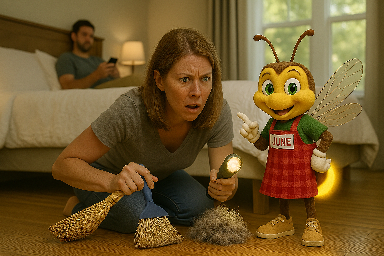 It all started when I dropped my phone behind the bed. One careless reach, and suddenly I was face-to-face with something no human should ever have to meet: The Dust Bunny. And not just a regular dust bunny. This thing had evolved. It wasn’t a bunny at all. It was a full-on dust jackalope — big enough to deserve a name, strong enough to stare back at me like it had squatter’s rights. I swear it even hissed when I poked it with a hanger. What began as a simple rescue mission for my phone turned into a full-scale military operation. I armed myself with a broom, a flashlight, and the kind of courage you only find after three cups of coffee. My husband volunteered to “supervise” (translation: he sat on the bed scrolling his phone). Underneath, I found not just the dust bunny but an archaeological dig site: Three mismatched socks. A hair tie colony. A school permission slip from last fall (signed, thank you very much). And one petrified gummy bear, which I may or may not have screamed at before launching into the trash can like it was toxic waste. The battle was long, but victory was mine. The dust bunny didn’t go quietly — it fought back with sneezes and an alarming amount of gray fluff — but eventually, I dragged it out into the daylight and vacuumed it into oblivion. Cue triumphant music. I flopped on the bed afterward, sweaty, victorious, and already knowing this war would have to be fought again. Because dust bunnies are like Hydra: defeat one, and three more will rise in its place. June Buzzes In 🐞✨ “Hey kids, it’s June! Want to help keep dust bunnies from turning into dust monsters? Here’s a fun game: put socks on your hands and crawl under the bed like ‘Dust Puppet Warriors.’ Wipe around as you go, and watch the bunnies disappear. Bonus points for silly voices while you do it!” Here’s the truth: cleaning under the bed is like flossing your teeth. You know you should do it, you avoid it as long as possible, and when you finally do, you feel like you’ve accomplished something heroic. So yes, I declared war on the dust bunny under my bed. And while I won this round, the battle never really ends. At least now I know my phone is safe — until next time. And if your dust bunnies have reached “small farm animal” status? That’s when you call in Lightning Bug Cleaners. We’ve got the gear, the grit, and zero fear of under-bed monsters.